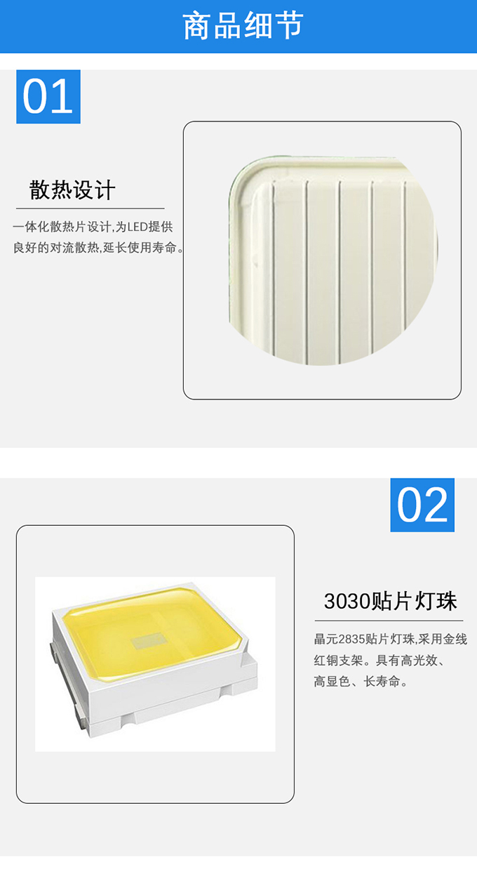 3.晶元2835貼片燈珠,采用金線(xiàn)紅銅支架。具有高光效、高顯色、長(zhǎng)壽命。
