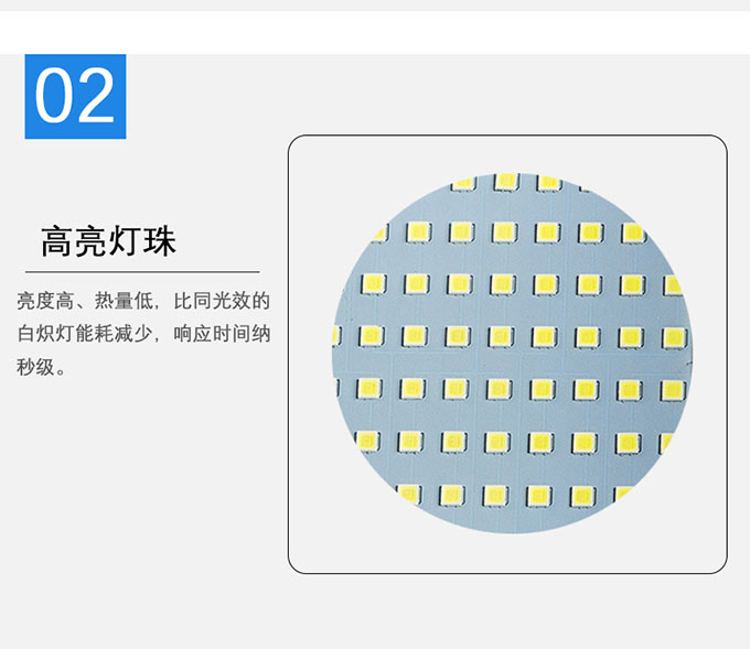 2.高亮燈珠,亮度高、熱量低,比同光效的白熾燈能耗減少,響應(yīng)時間納秒級。