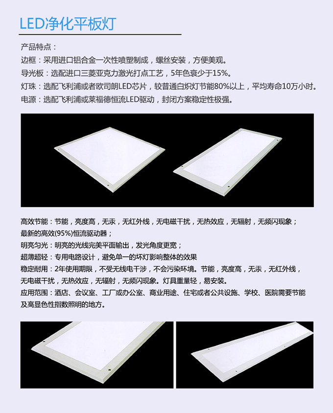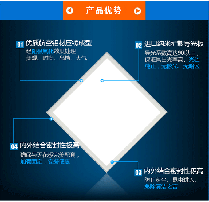 - 產品簡介:產品特點: 1.框架采用6063航空鋁,導熱系數好,散熱快,減少整燈光衰。 2.直邊設計,不積塵,易清潔,同時可以有效減少空氣對流阻力,使室內空氣更清新。 3.燈珠采用2835型號,264珠,不滿載使用,工作電流45MA,較少整燈光衰。 4.導光板采用3MM曰本三菱板材/臺灣奇美板材,光效好,均勻度好,不會隨著使用時間出現發(fā)黃或中間暗兩邊亮的現象。 5.擴散板采用PS材料,抗沖擊力強。 6.電源采用進口IC,防水灌膠處理,更好的散熱,無頻閃,不易產生視覺疲勞,適合好精度或長時間工作者。 7.
