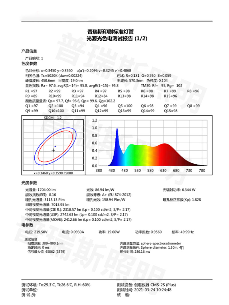 采用LED產(chǎn)品生產(chǎn)標準印刷燈管還屬首次,技術難度大,工程師經(jīng)過多次調(diào)試,克服困難 ,終于成功。這批光源采用定制全色譜LED芯片,包含有大部份的太陽光譜成份,顯色指數(shù)高達97.6%,可用作專業(yè)的色彩匹配,是觀察顏色的最理想的光源。