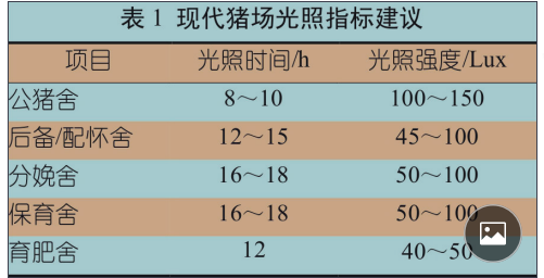 美國(guó)農(nóng)業(yè)生物工程學(xué)會(huì)建議后備 / 配懷母 豬合適的光照強(qiáng)度在 100 Lux 左右,光照時(shí) 間為每天 14 h ~ 16 h。