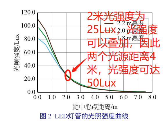 以 LED 燈 管 (18 W、2 100 lm、 6 500 K) 作為單光源對(duì)分娩舍內(nèi)的光源進(jìn)行 布置。LED 燈管的光照強(qiáng)度曲線(xiàn)如圖 2。分娩 舍所需的光照強(qiáng)度為 50 Lux ~ 100 Lux。從 圖 2 查得在地面距離燈管中心水平距離 2 m 處的光照強(qiáng)度為 25 Lux。根據(jù)光照強(qiáng)度的可 疊加性,將兩燈管的水平距離設(shè)置為 4 m,則 在兩燈管水平距離中心處地面的光照強(qiáng)度為 50 Lux,滿(mǎn)足分娩舍光照強(qiáng)度需求。